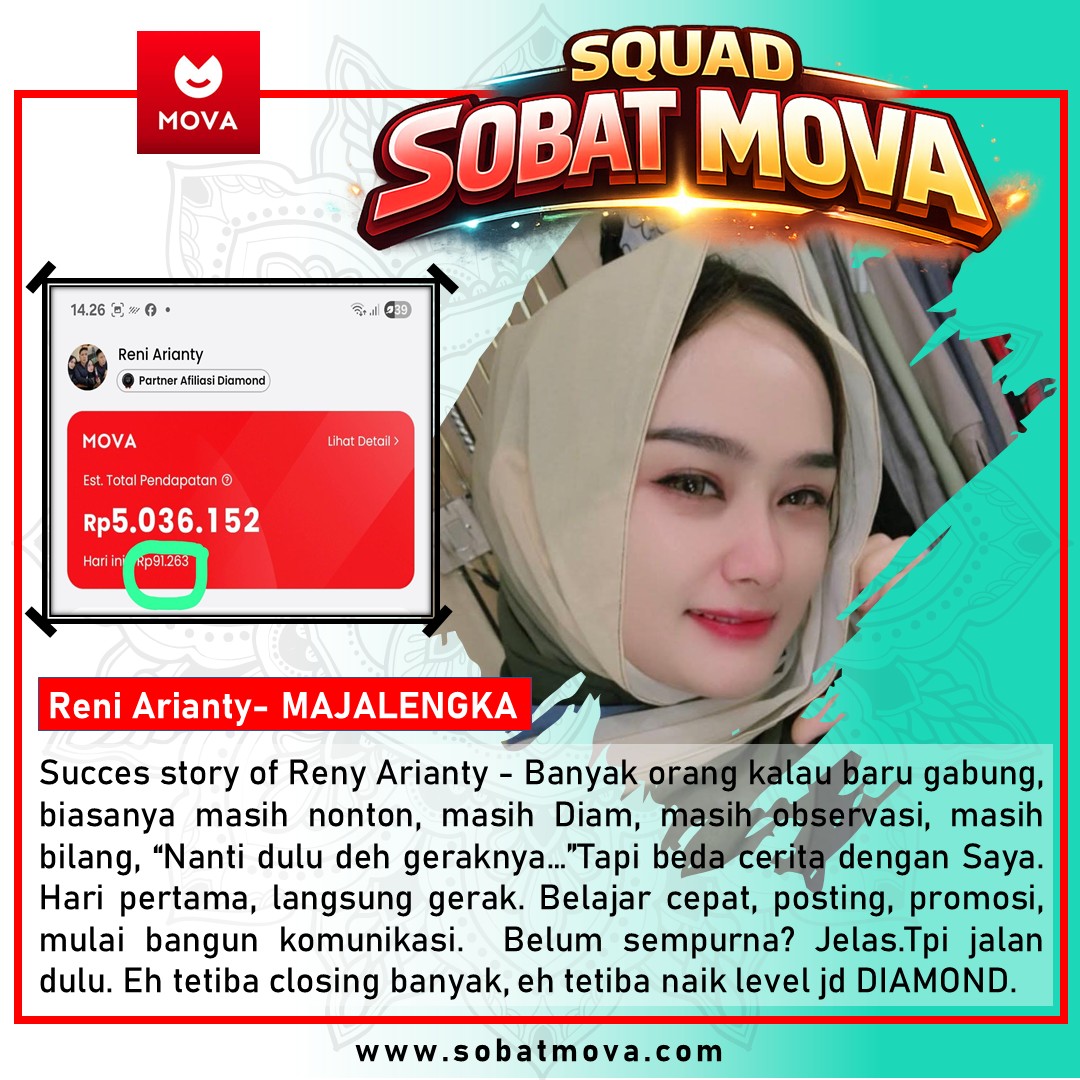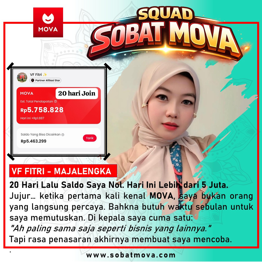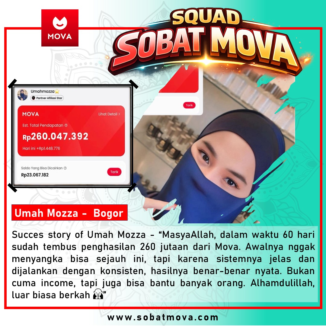 “Alhamdulillah sejak kenal Mova, saya jadi punya penghasilan tambahan tanpa harus meninggalkan pekerjaan utama. Sistemnya jelas, mudah dijalankan, dan yang paling penting—bisa bantu banyak orang. MasyaAllah, berkah banget 🙏”