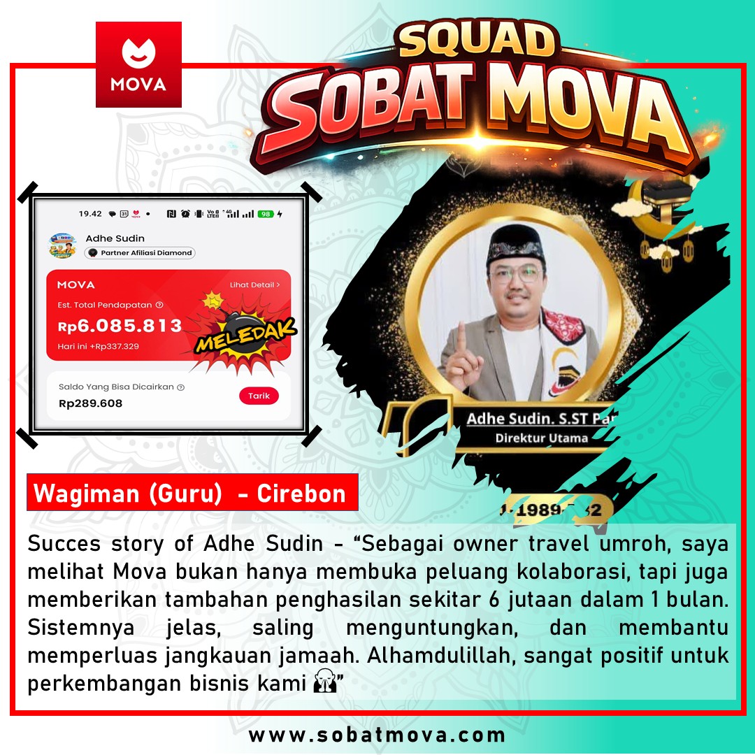 “Sebagai owner travel umroh, saya melihat Mova bukan hanya membuka peluang kolaborasi, tapi juga memberikan tambahan penghasilan sekitar 6 jutaan dalam 1 bulan. Sistemnya jelas, saling menguntungkan, dan membantu memperluas jangkauan jamaah. Alhamdulillah, sangat positif untuk perkembangan bisnis kami 🙏”