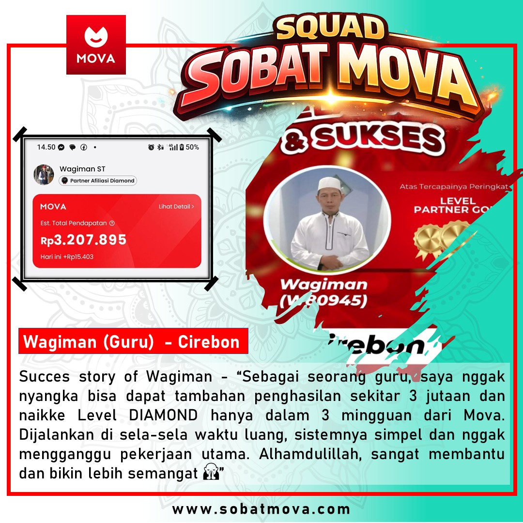 “Sebagai seorang guru, saya nggak nyangka bisa dapat tambahan penghasilan sekitar 3 jutaan dan naikke Level DIAMOND hanya dalam 3 mingguan dari Mova. Dijalankan di sela-sela waktu luang, sistemnya simpel dan nggak mengganggu pekerjaan utama. Alhamdulillah, sangat membantu dan bikin lebih semangat 🙏”